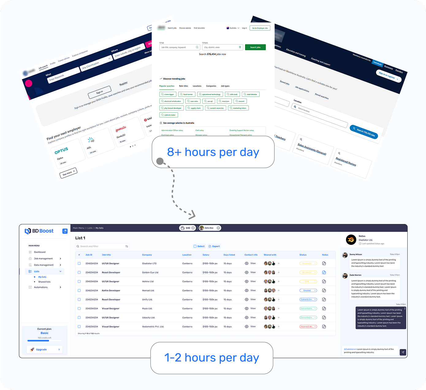 BD BOOST automates business development for recruiters, giving you direct access to job listings, company details, and hiring contacts —plus AI-driven candidate summaries that match job listings instantly.