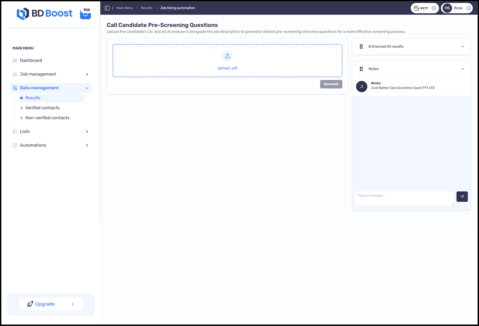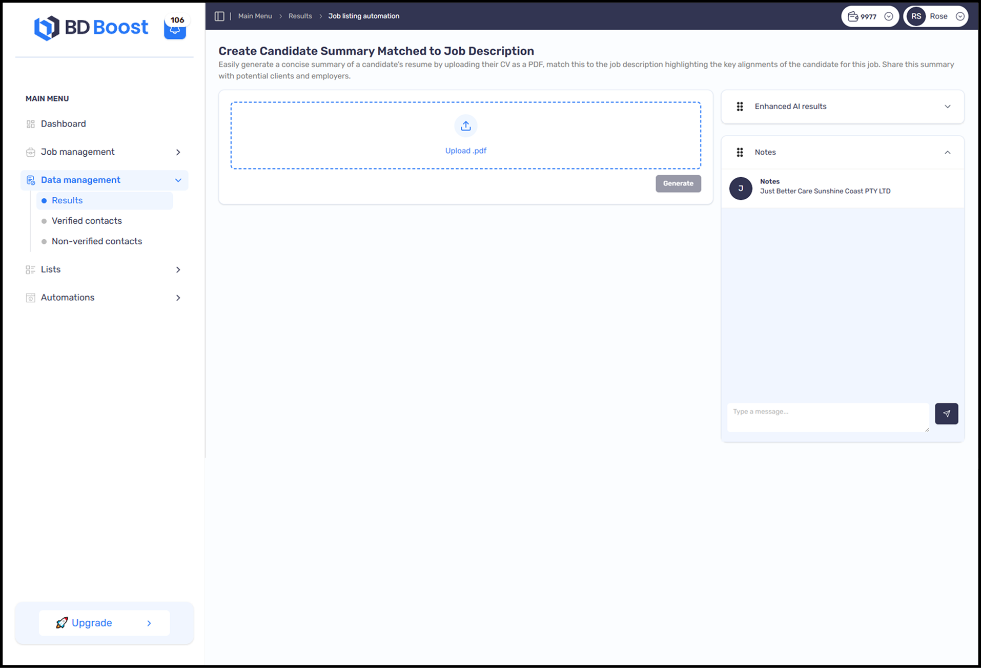 Upload a candidate’s CV as a PDF, and BD BOOST will generate a targeted candidate summary for the recruiter.
